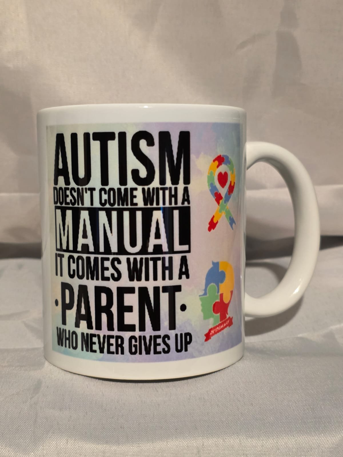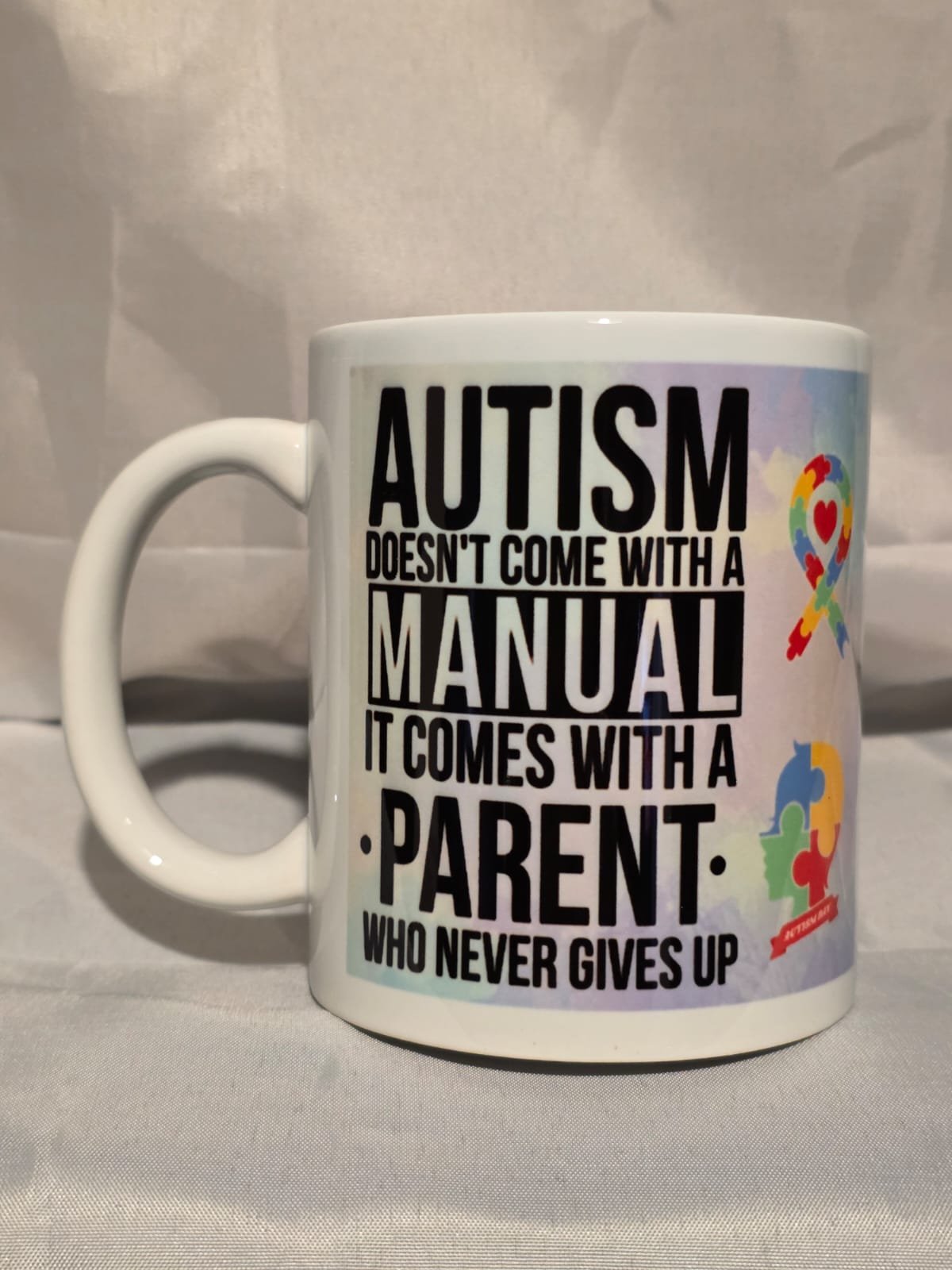 The 11oz Mug “Autism Doesn’t Come With A Manual It Comes With A Parent Who Never Gives Up” is handmade by MuggedMeOff in the United Kingdom using professional grade sublimation ink meaning it will be dishwasher and microwave safe. The Mug is Ceramic and hardwearing so it will last you a long time and can hold hot and cold drinks with ease giving you a pleasant drinking experience whether you’re a tea, coffee or any other type of drinker these Mugs are perfect.