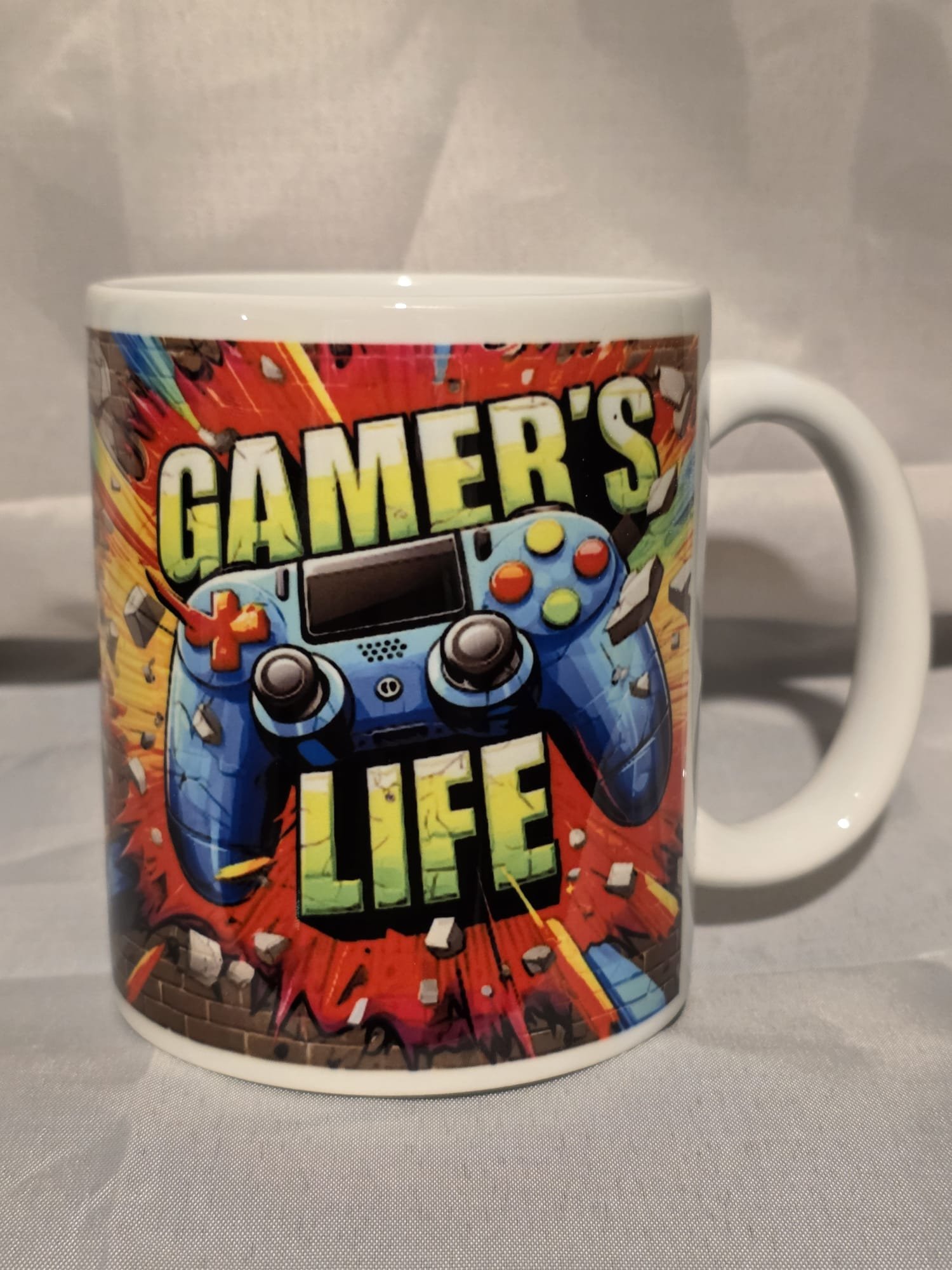 The 11oz Mug “Gamer’s Life” is handmade by MuggedMeOff in the United Kingdom using professional grade sublimation ink meaning it will be dishwasher and microwave safe. The Mug is Ceramic and hardwearing so it will last you a long time and can hold hot and cold drinks with ease giving you a pleasant drinking experience whether you’re a tea, coffee or any other type of drinker these Mugs are perfect.