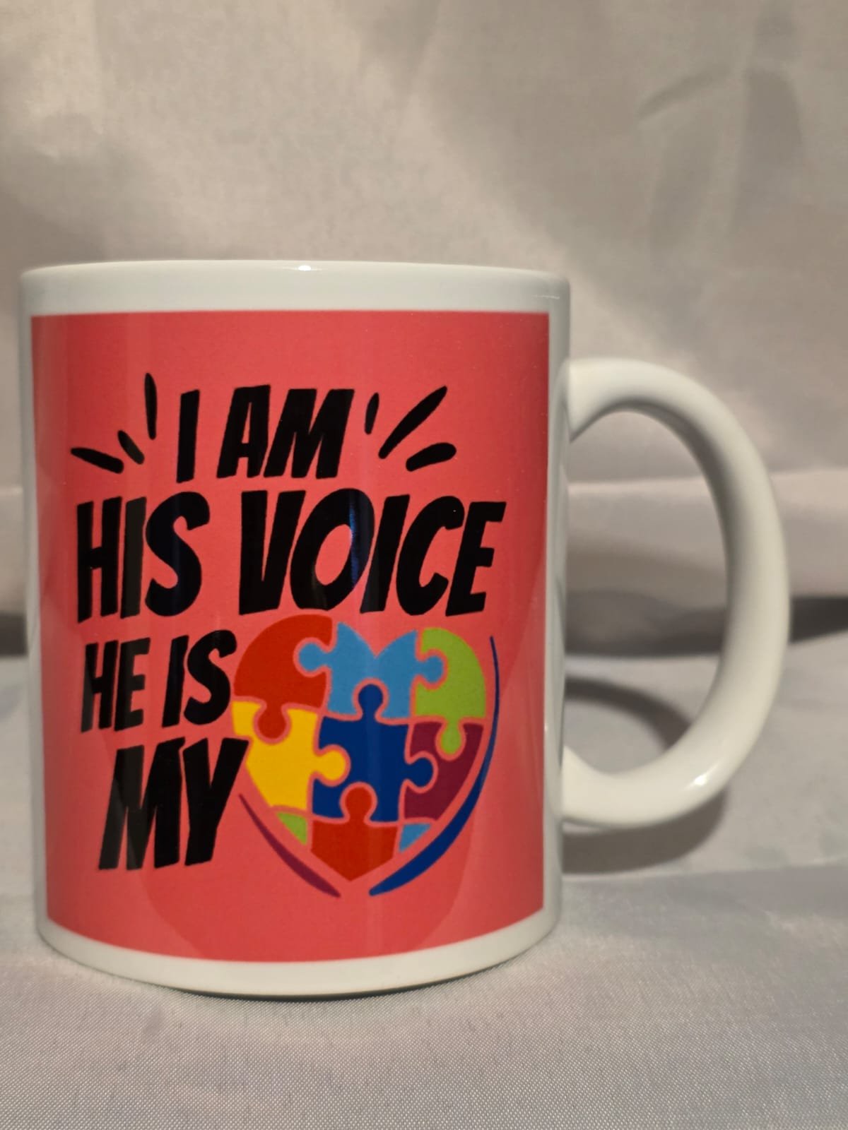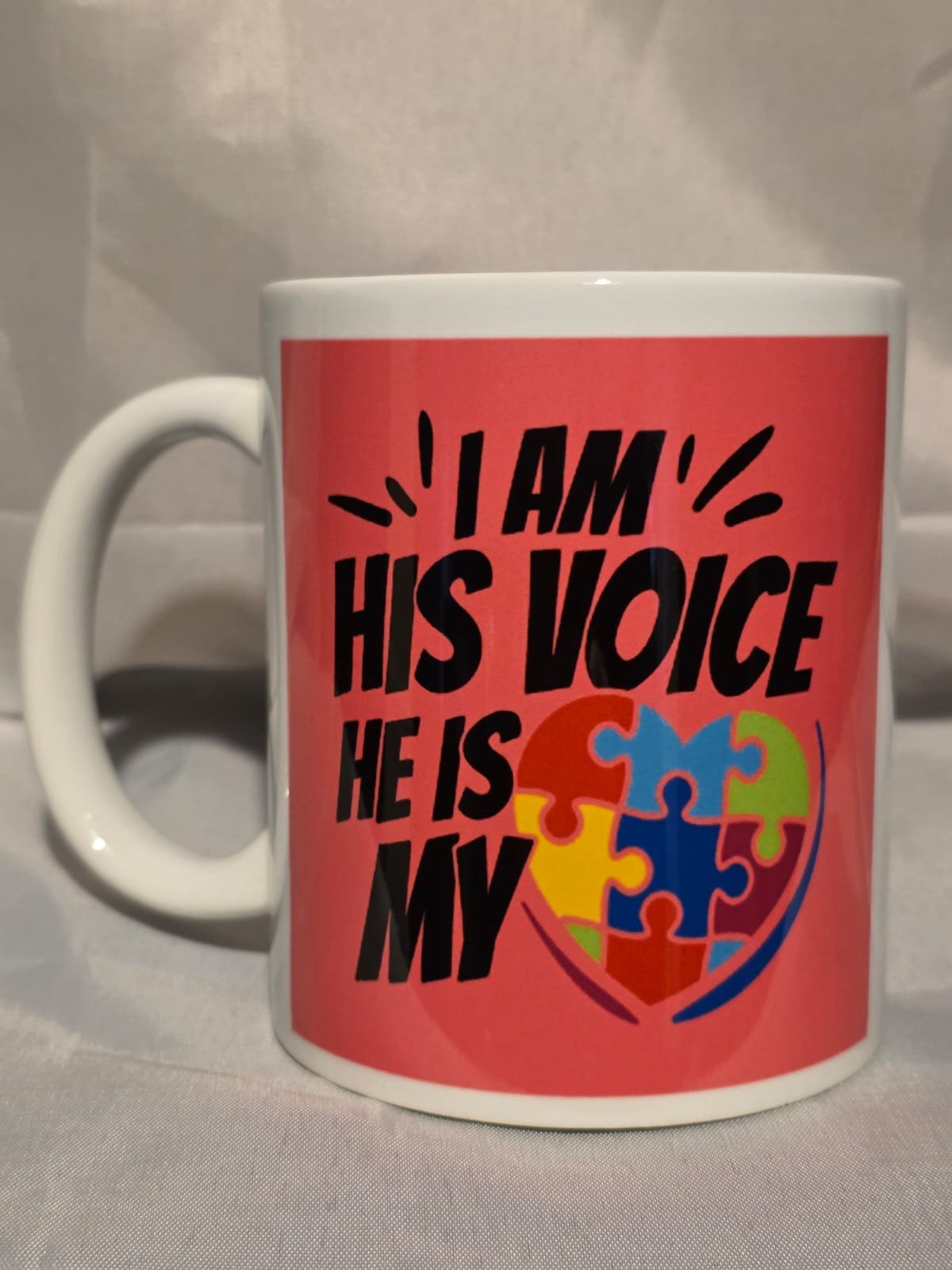 The 11oz Mug “I Am His Voice He Is My Heart” is handmade by MuggedMeOff in the United Kingdom using professional grade sublimation ink meaning it will be dishwasher and microwave safe. The Mug is Ceramic and hardwearing so it will last you a long time and can hold hot and cold drinks with ease giving you a pleasant drinking experience whether you’re a tea, coffee or any other type of drinker these Mugs are perfect.