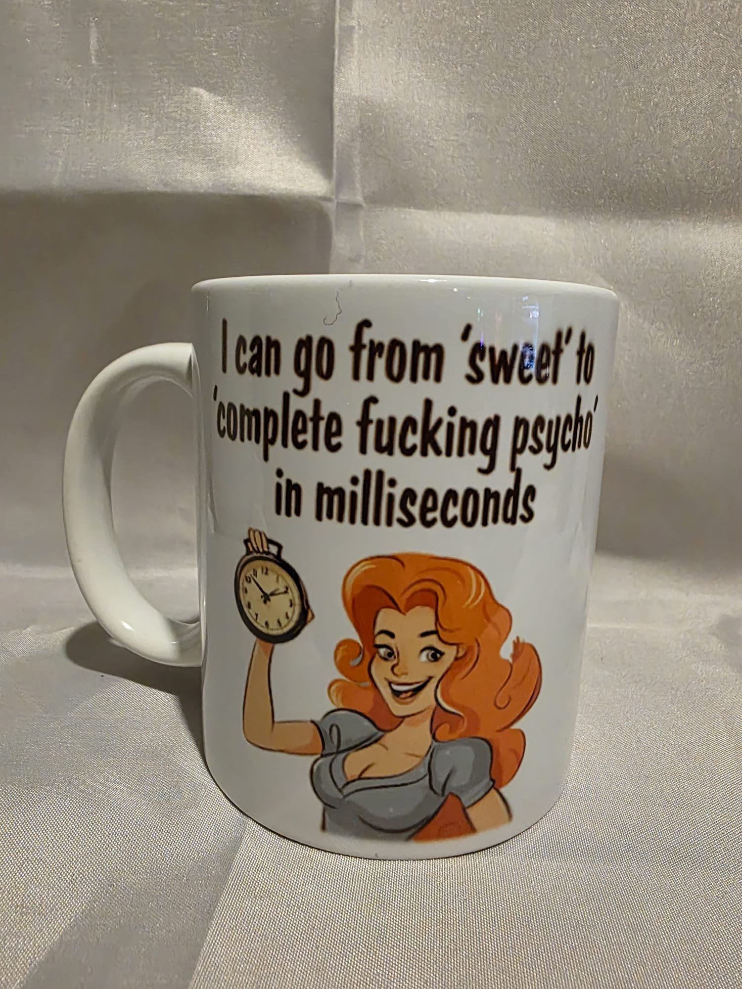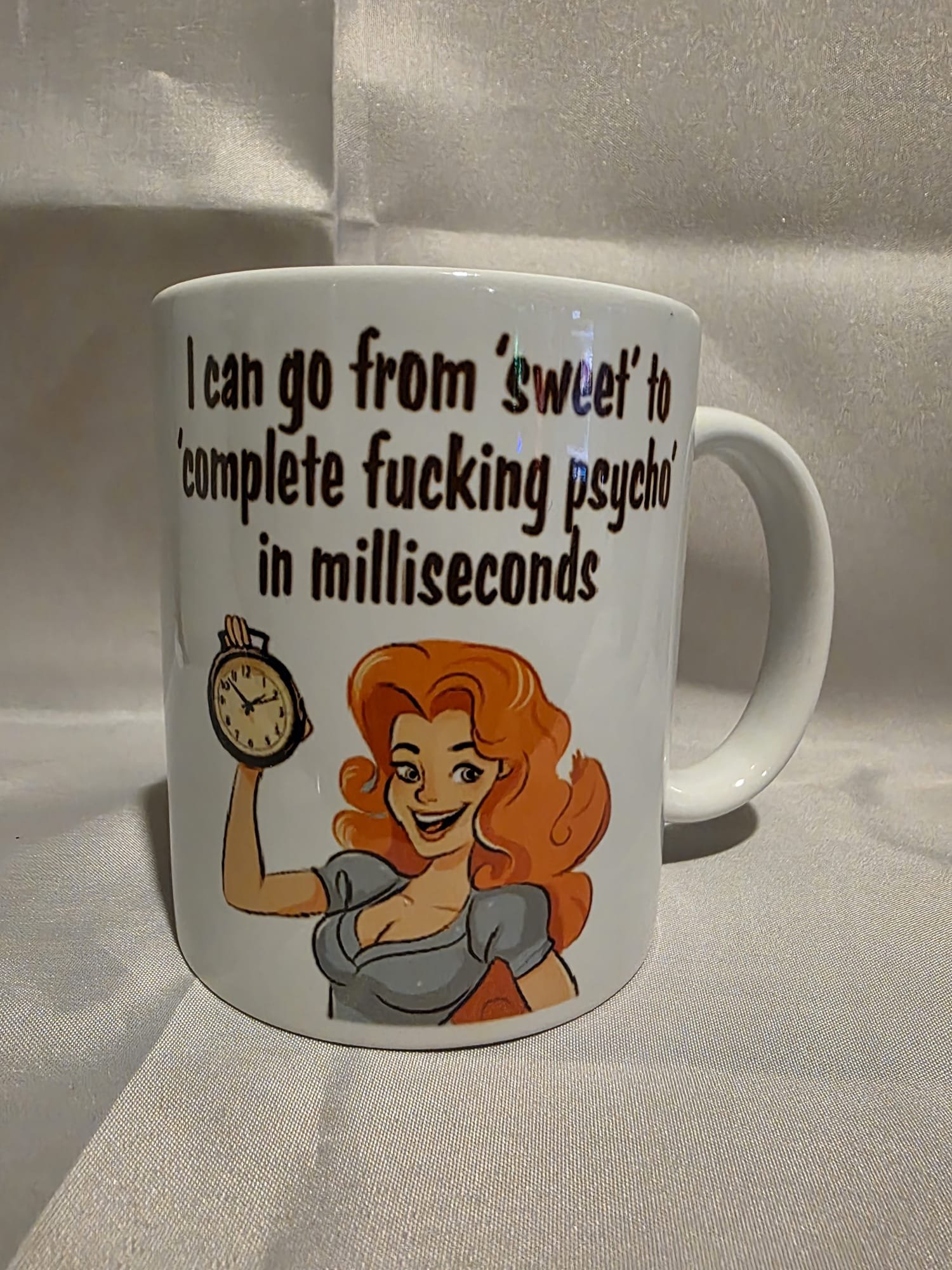 The 11oz Mug “I Can Go From ‘Sweet’ To Complete Fucking Psycho In Milliseconds” is handmade by MuggedMeOff in the United Kingdom using professional grade sublimation ink meaning it will be dishwasher and microwave safe. The Mug is Ceramic and hardwearing so it will last you a long time and can hold hot and cold drinks with ease giving you a pleasant drinking experience whether you’re a tea, coffee or any other type of drinker these Mugs are perfect.