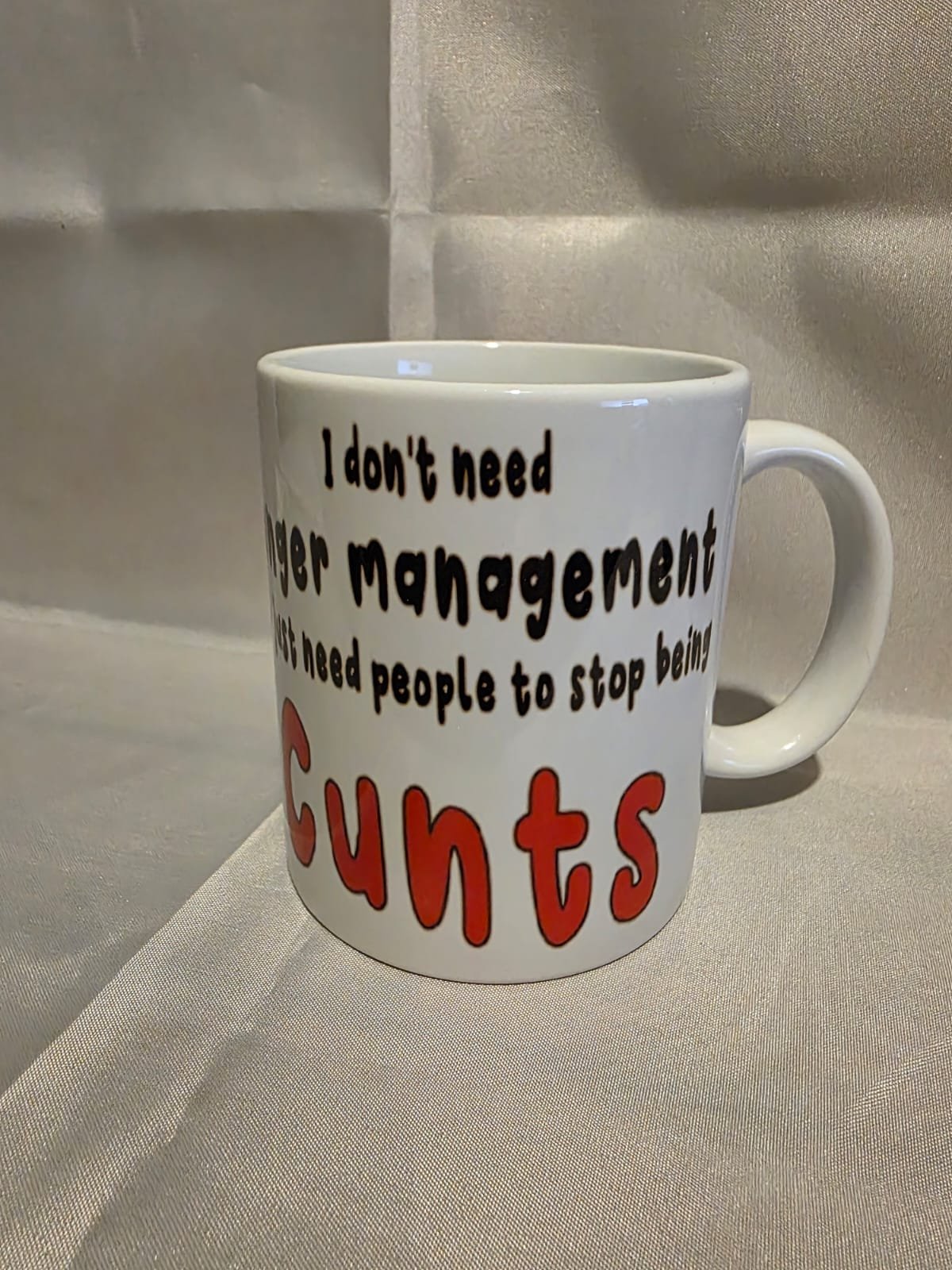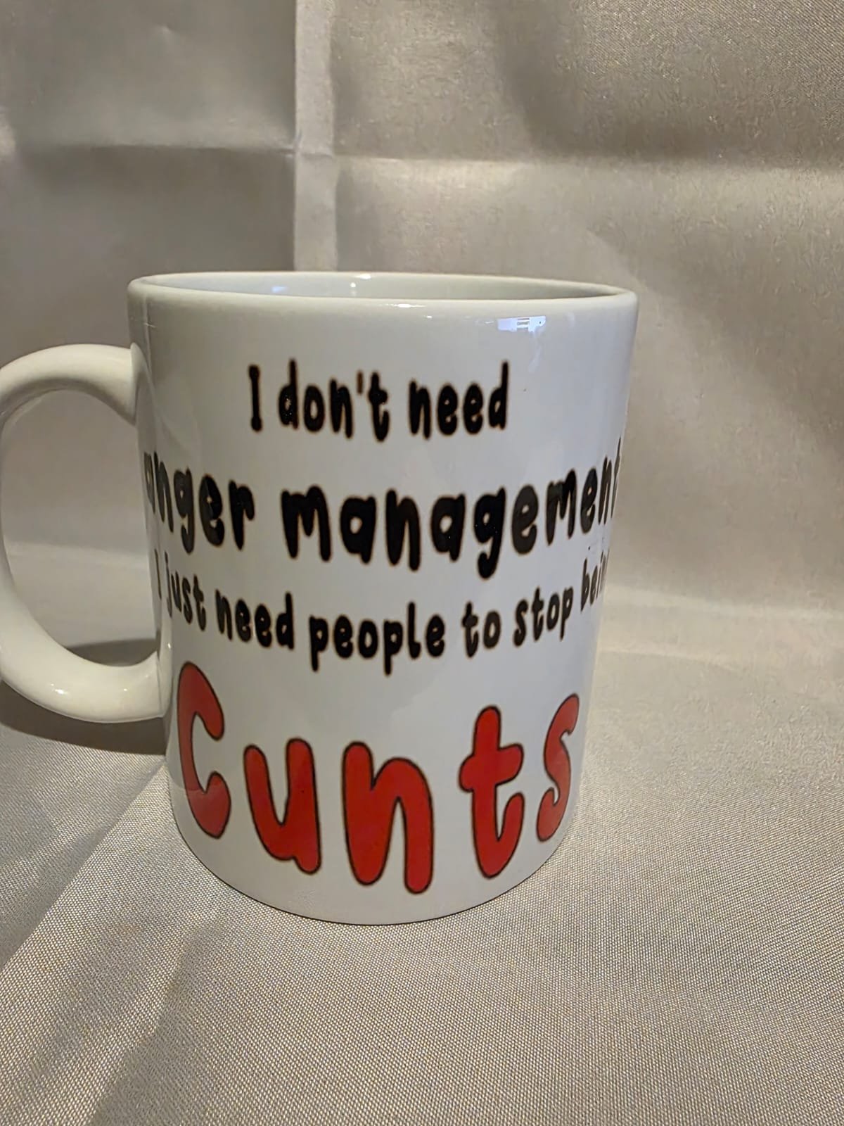 The 11oz Mug “I Don’t Need Anger Management I Just Need People To Stop Being Cunts” is handmade by MuggedMeOff in the United Kingdom using professional grade sublimation ink meaning it will be dishwasher and microwave safe. The Mug is Ceramic and hardwearing so it will last you a long time and can hold hot and cold drinks with ease giving you a pleasant drinking experience whether you’re a tea, coffee or any other type of drinker these Mugs are perfect.