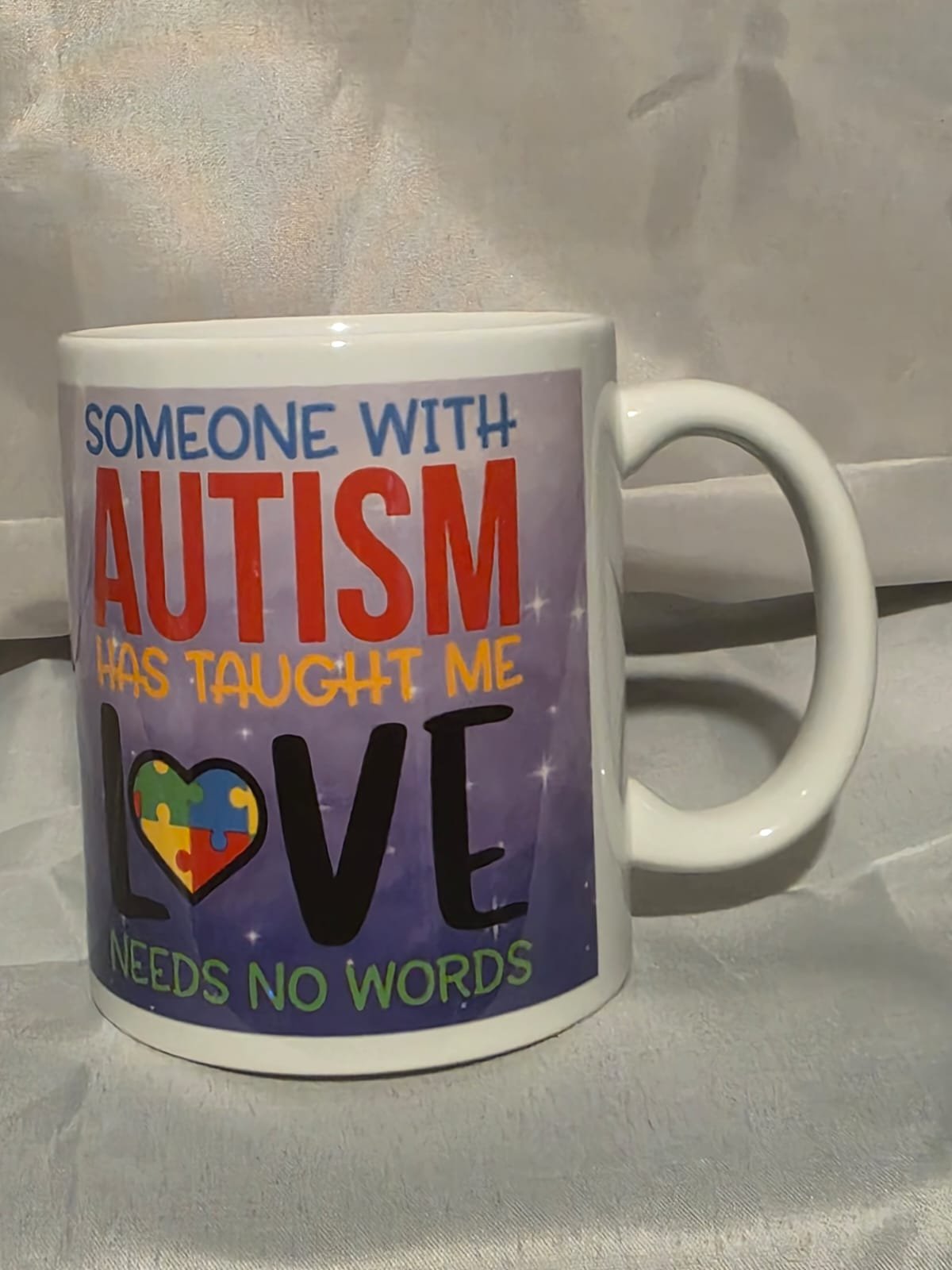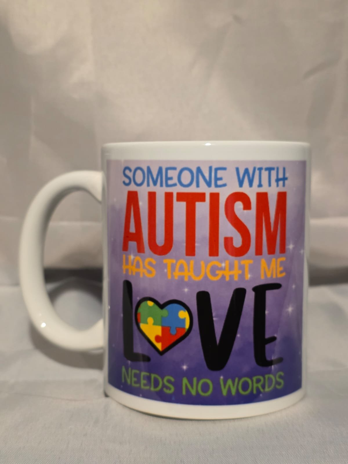 The 11oz Mug “Someone With Autism Has Taught Me Love Needs No Words” is handmade by MuggedMeOff in the United Kingdom using professional grade sublimation ink meaning it will be dishwasher and microwave safe. The Mug is Ceramic and hardwearing so it will last you a long time and can hold hot and cold drinks with ease giving you a pleasant drinking experience whether you’re a tea, coffee or any other type of drinker these Mugs are perfect.