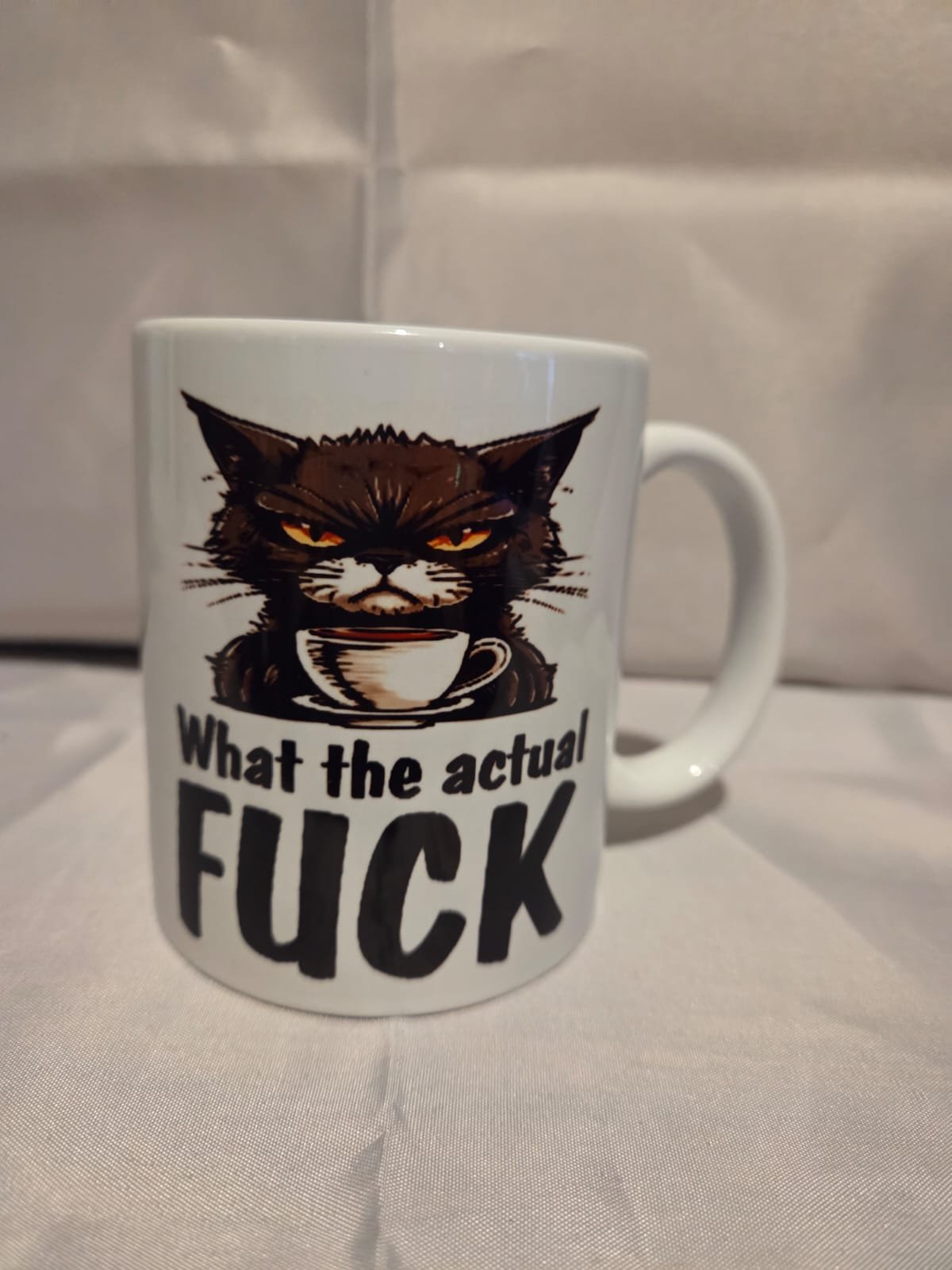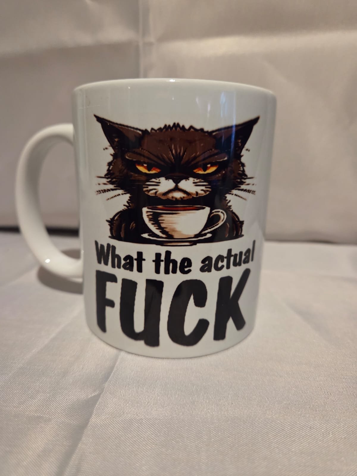 The 11oz Mug “What The Actual Fuck” is handmade by MuggedMeOff in the United Kingdom using professional grade sublimation ink meaning it will be dishwasher and microwave safe. The Mug is Ceramic and hardwearing so it will last you a long time and can hold hot and cold drinks with ease giving you a pleasant drinking experience whether you’re a tea, coffee or any other type of drinker these Mugs are perfect.